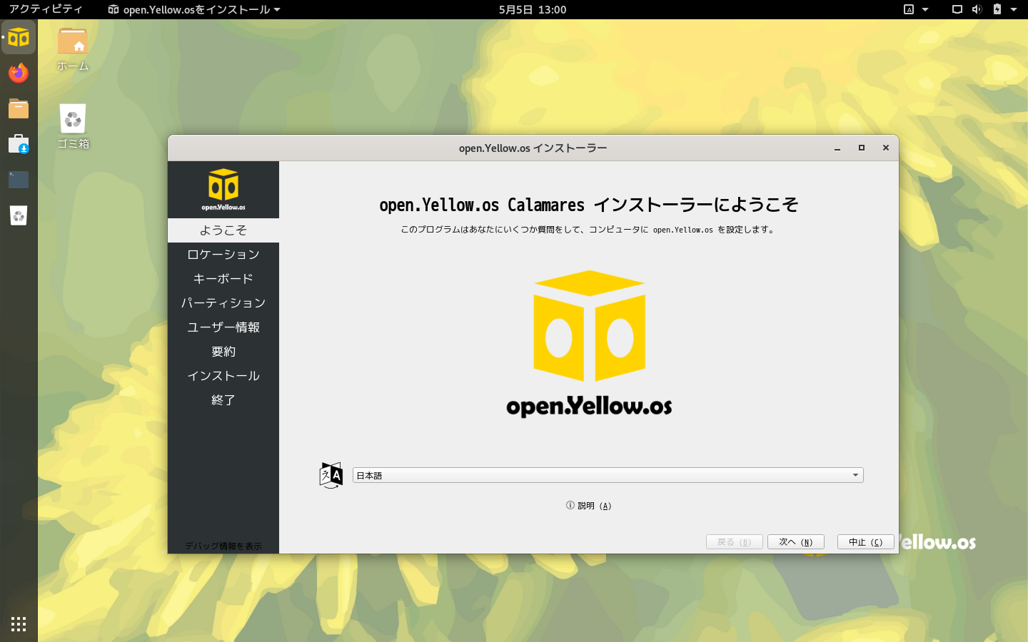 インストーラーは見慣れた「Calamares」。左に表示されるランチャーから黄色い箱のロゴをクリックすると起動する。