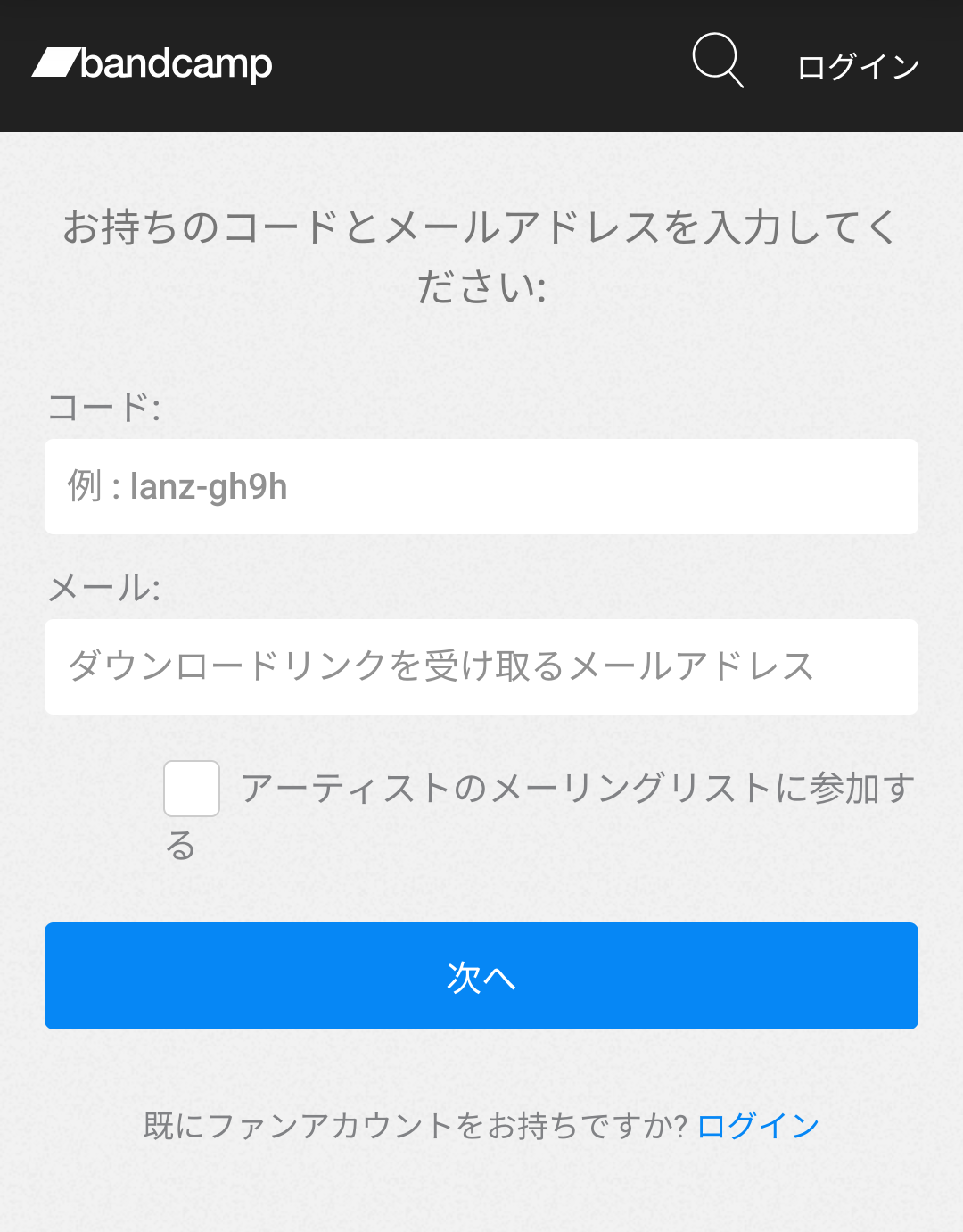 ※メールアドレスの入力は任意ですが、入力をお勧めします。その際は間違いがないよう十分ご注意下さい。「bandcamp.com」からのメールが受信できるよう設定をしておいて下さい。