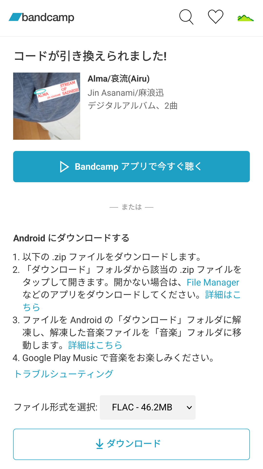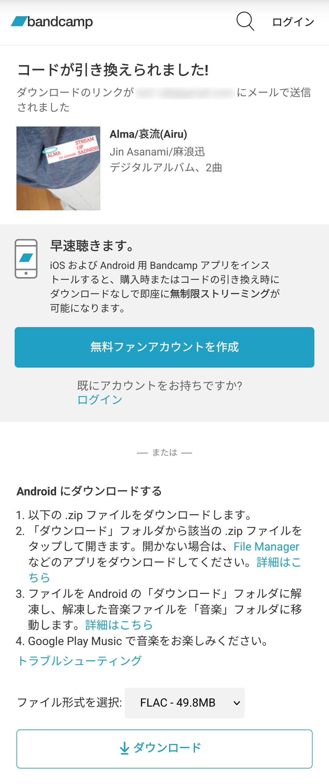 Bandcampにログイン済みの方は、アプリを使ってストリーミング再生も可能です(ファンアカウントが必要)。